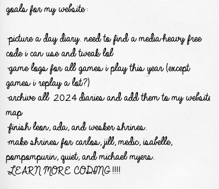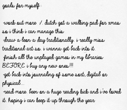 not sure what my goals are for myself and my site are this year but i mostly just wanna be able to enjoy my hobbies with the free time i'm given without pressuring myself with too much and burning myself out of them. so i guess this years goal is to enjoy the little things and go a bit easier on myself. really want a year where i don't hate myself for 90% of it so. here's to hoping.