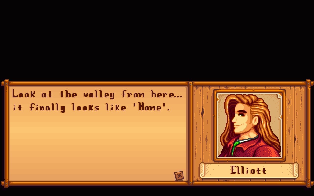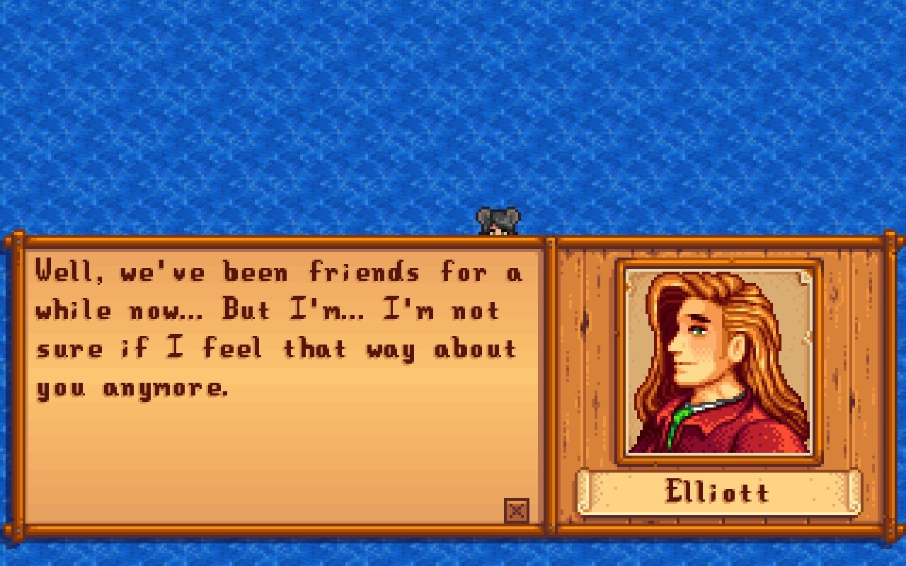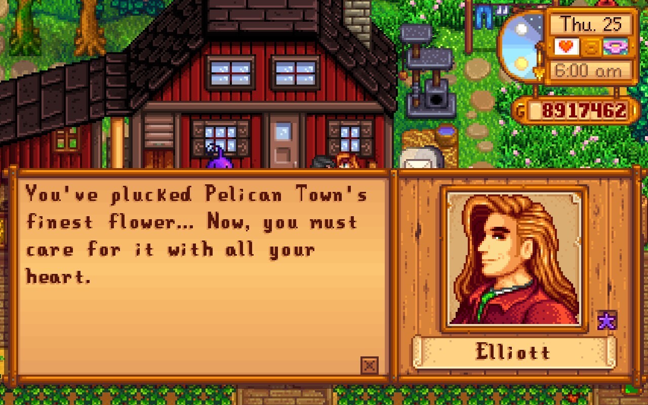 elliott is cute but he's already hit me with the oh i'm not.. bored, life is slow here or whatever line and i'm like we've literally been married one day you Asshole. At least try and be impressed with how insanely well i run this farm. hoping that he doesnt cycle through this one a lot LOL but if he keeps it up i may divorce him and move krobus back in idk. hell, maybe i'll marry haley again.