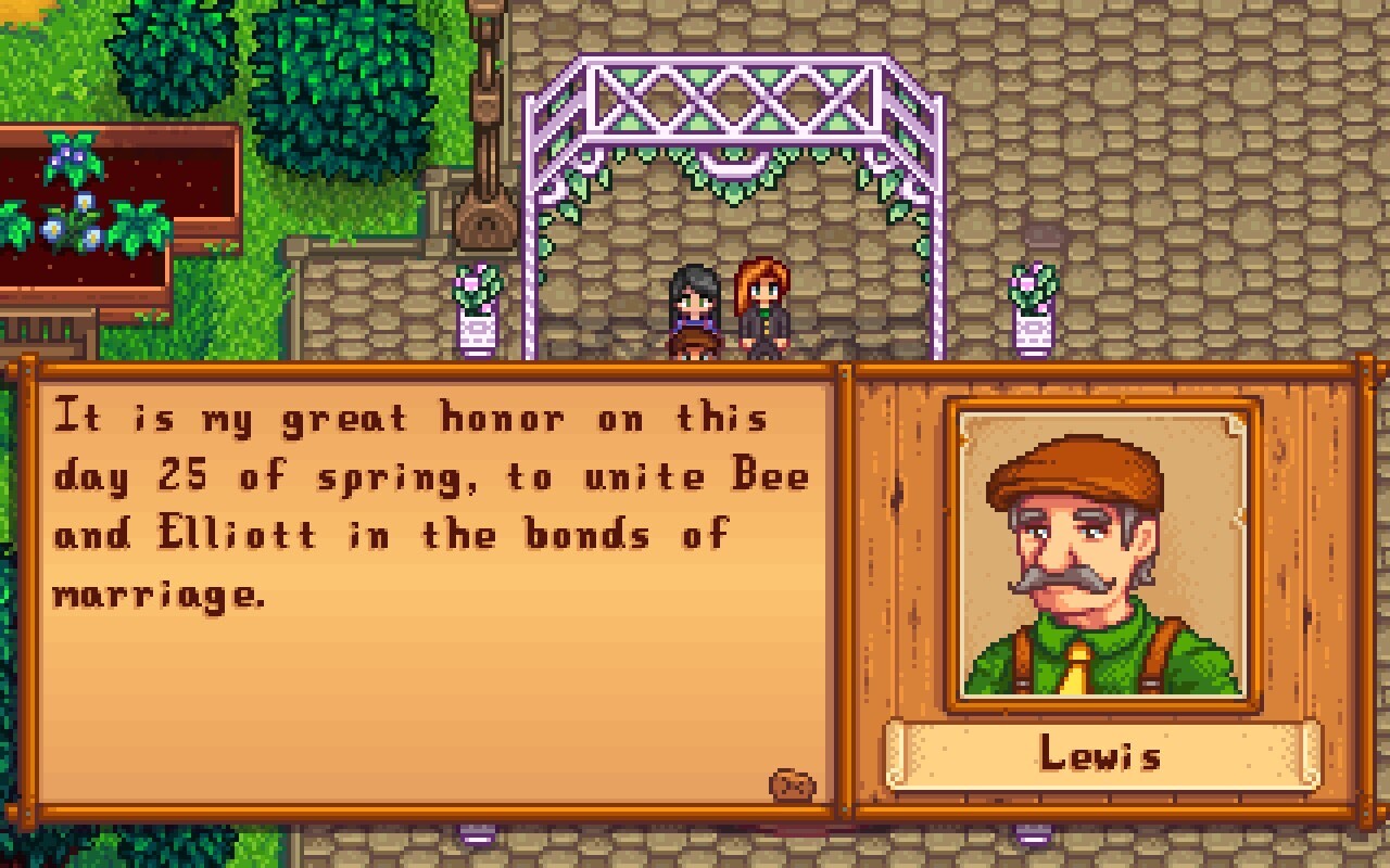 i somehow managed getting the mermaid pendant and asking him to marry me all in one day despite being short one heart. i'd been carrying around iridium quality duck feathers, so i know that definitely helped get the final heart i needed to marry him ASAP. Our wedding was on the 25th of spring, after the flower dance!